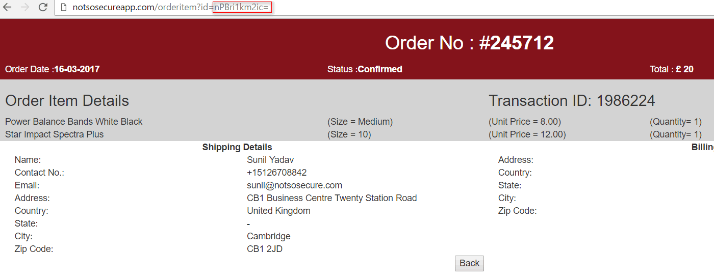 Here is an example of the order details page wherein the id (orderid) parameter is sent in an encrypted format.