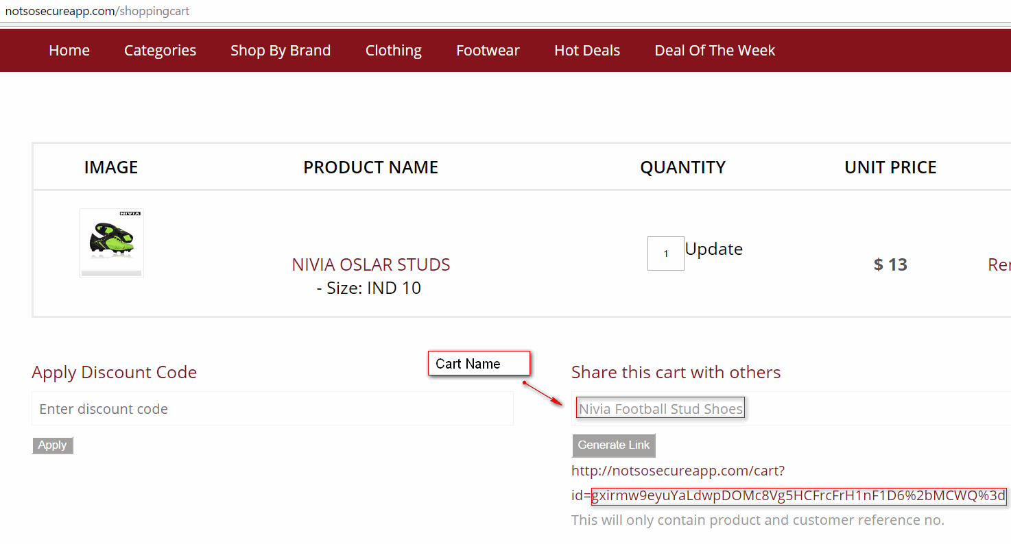 Then we stumbled upon a cart sharing feature. This feature allows users to share the cart items with others. When a user saves the cart for sharing, a link is generated with a random looking token. By accessing this link (URL) users can access each other’s cart. Before the cart can be saved, the users are asked to put a name to the cart.
