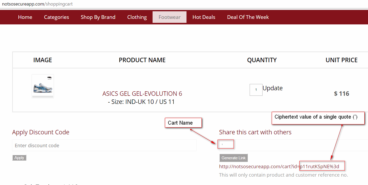 Note: Share cart feature was not vulnerable to any attack but it can be used to generate the encrypted payload (ciphertext) for the given input (plaintext). Now an encrypted attack payload can be generated to check the application’s behaviour for vulnerabilities like SQL Injection, Authorization Bypass, etc. To test for SQL Injection, an encrypted value of single quote (‘) was generated as shown below:
