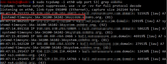 Upon sending this, we can see queries for the FQDN (which includes the encoded data from line 19 of /etc/passwd), via tcpdump on our server that is configured to be the authoritative server for the domain, as shown below.