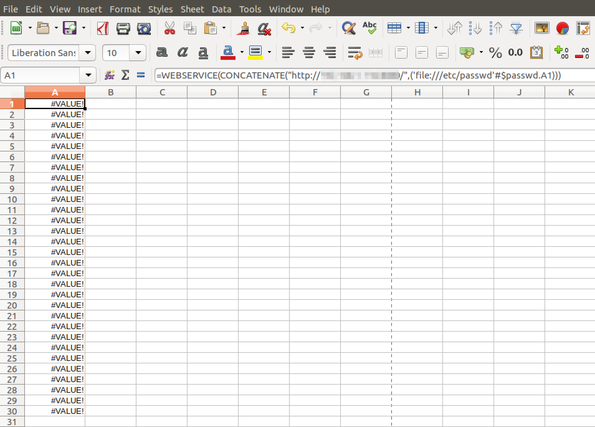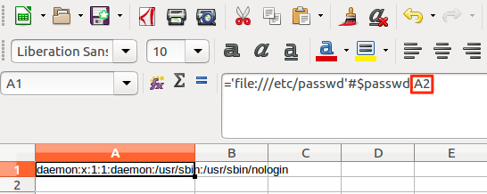 We first tried to read sensitive files via formulas using our local access. LibreOffice offers to read a file using the “file” protocol. An initial PoC to retrieve a single line from the local /etc/passwd file was created and is detailed below.
