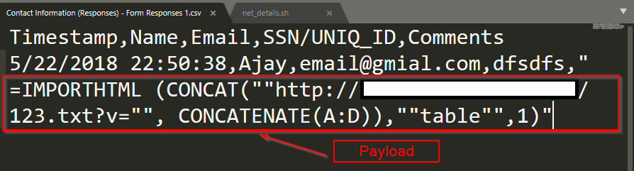 Google provide functionality to create forms and receive responses, which later can be accessed using Google sheets. We attempted to exploit this issue by submitting a malicious formula in the comments section of the respective Google form. However, Google was performing sanity checks on responses submitted and it automatically added an (‘) apostrophe before the formula, thus stopping the formula from executing.