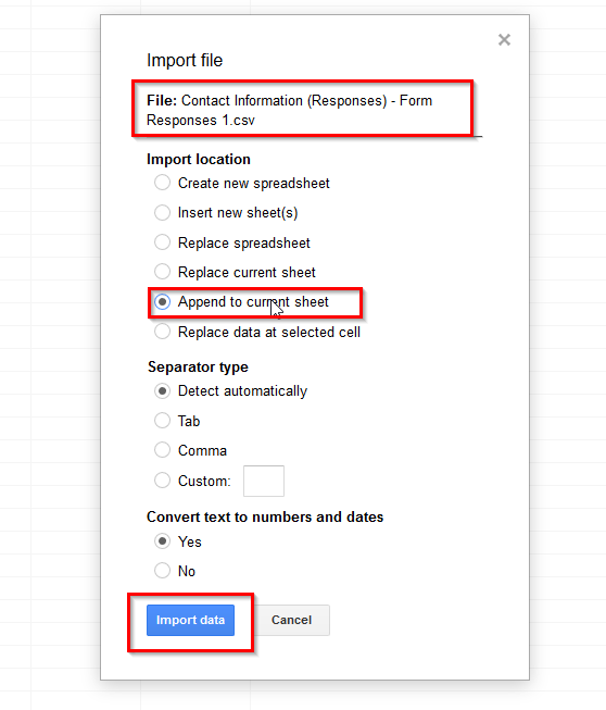 2) We then imported the csv file into Google Sheets using the import functionality, and appended the data to the existing sheet.