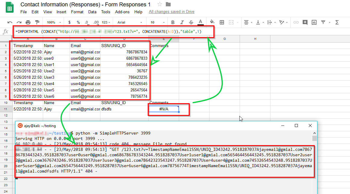 3) Once the data was imported our payload executed and we received the details of users like name, email and SSN data on a HTTP server listening on our attacking server.