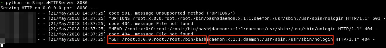Looking at the attacking host we can see the corresponding entries from /etc/passwd within the GET request, separated in this instance by the $ character (CHAR 36).