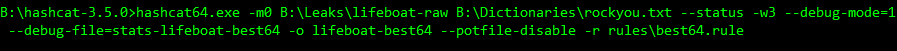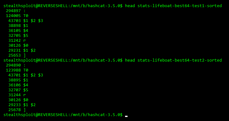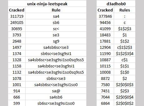 The potfile was disabled so that hashcat didn’t check it prior to each crack and skew our numbers. Debug mode can only be enabled when using rules and the debug file contains the stats. Every time a rule cracks a hash it’s logged in the file. After hashcat completes, the file can then be sorted to show the number of times a rule was successful, therefore revealing the most successful rules in each set.