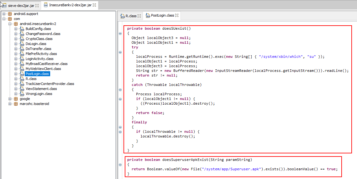 The application uses two functions to check whether the device is rooted or not as shown below in the decompiled APK of the InsecureBank app