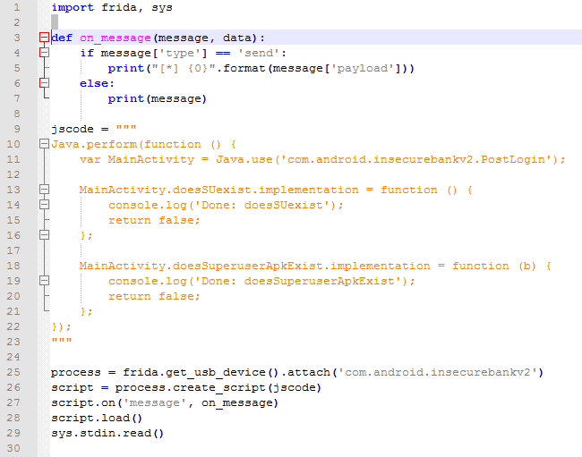 To bypass these root detection techniques you would have to decompile the APK, edit the smali files and then repackage it by patching the methods which are implemented for root detection. It's a fairly tedious process but using Frida, it really is relatively simple as we’ll see in the next example of InsecureBank2 Android application.