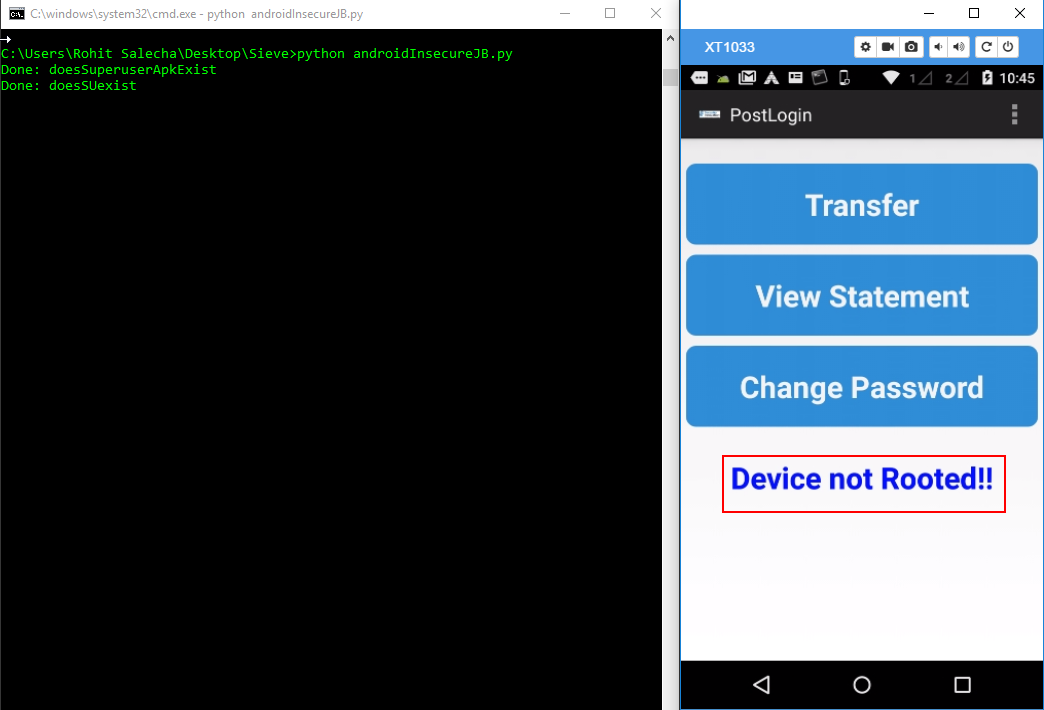 Using the below javascript code we bypass the root detection logic and that’s why we get the message “Device not Rooted”. The code is available here.