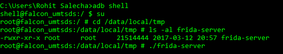 Modify the permissions for the frida-server binary using the command below and run as shown below