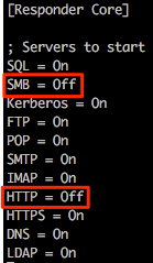 For this following example we’ll disable these specific services within the Responder.conf file by changing the relevant service to “Off”. Job done.