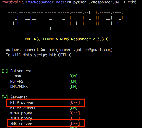 Again, running Responder with default options it is possible to see that these two services are now disabled.