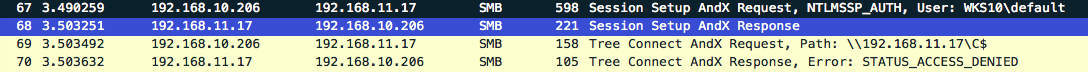 The following Wireshark output shows only the smb traffic involved within this initial relay communication where we can clearly see the relay route 192.168.10.17 (poisoned victim) > 192.168.10.206 (attacker) > 192.168.11.17 (relay target).
