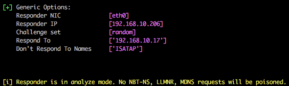 You can use Responder in listen only mode, i.e. analyse, but don’t actively respond to any requests. This can be achieved using the -A parameter and again this is a useful feature to see how chatty the network is without actively targeting any hosts.