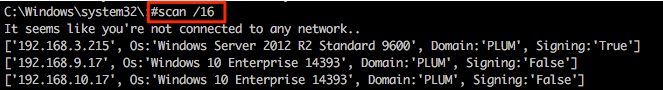 Other useful functionality includes the super quick SMB scanner that can be used to find other potential targets within the network. A example of this is shown in the following screenshot from which a /16 range was supplied (our example network is a 192.168.0.0/16 with each 192.168.X.0/24 range having identical systems for student lab work).
