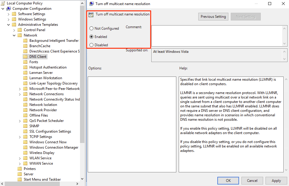 - Open gpedit.msc and navigate to Computer Configuration > Administrative Templates > Network > DNS Client > Turn off multicast name resolution and set to Enabled