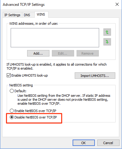 - This can be achieved by navigating through the GUI to Network card > Properties > IPv4 > Advanced > WINS and then under “NetBIOS setting” select Disable NetBIOS over TCP/IP