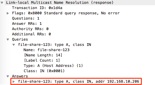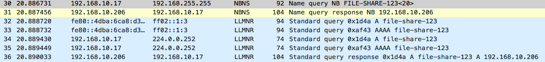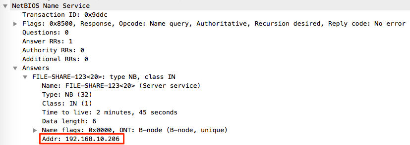 From the above Wireshark output it’s possible to see that 192.168.10.17 sends a NBNS query to the broadcast address 192.168.255.255, and the attacking host 192.168.10.206 immediately replies stating that it is in fact file-share-123 and returns it’s own IP within the response.